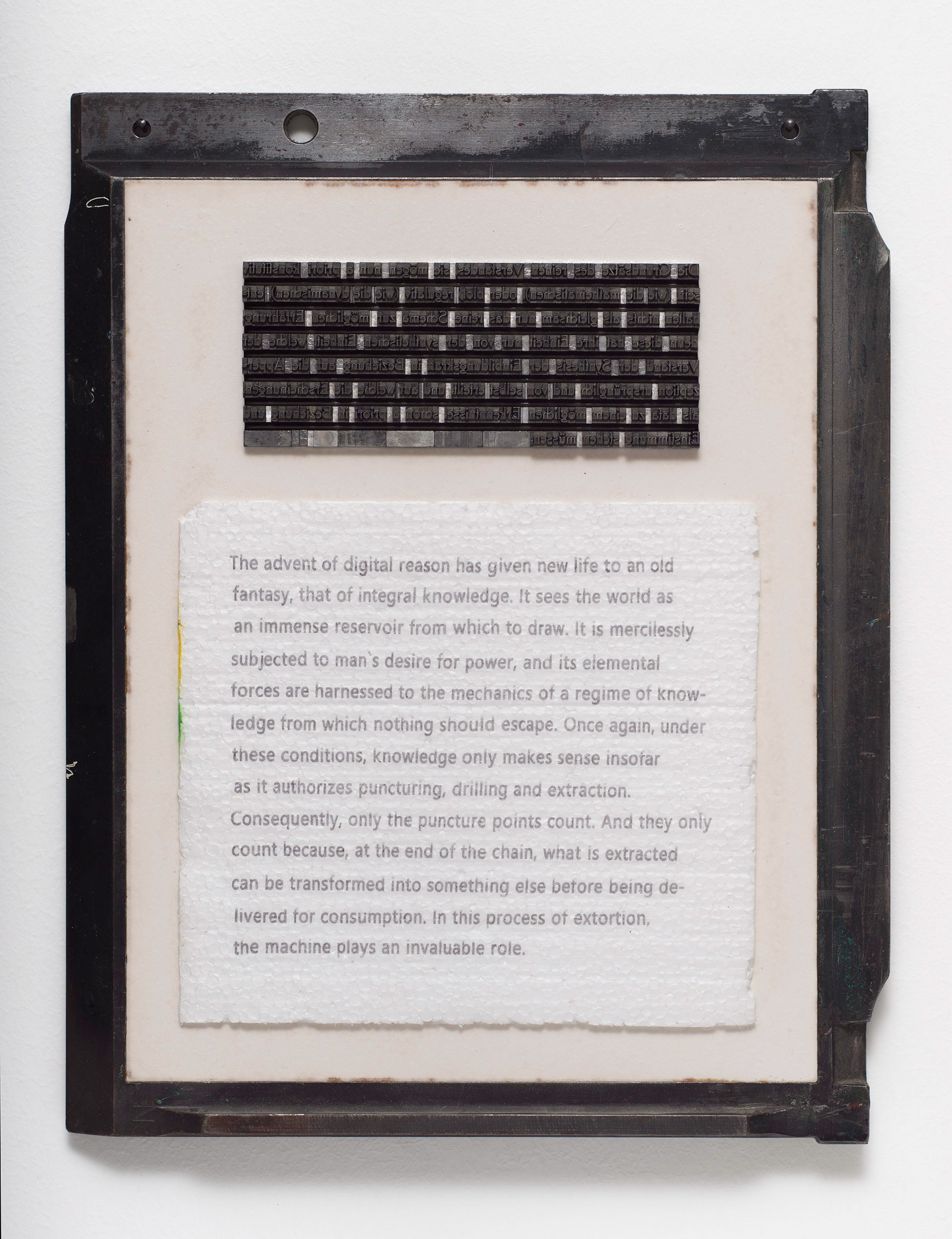 The quote by Kant is set in lead type in an Antiqua in 16p. The block of type was cast with resin so it doesn’t fall apart. The quote by Mbembe