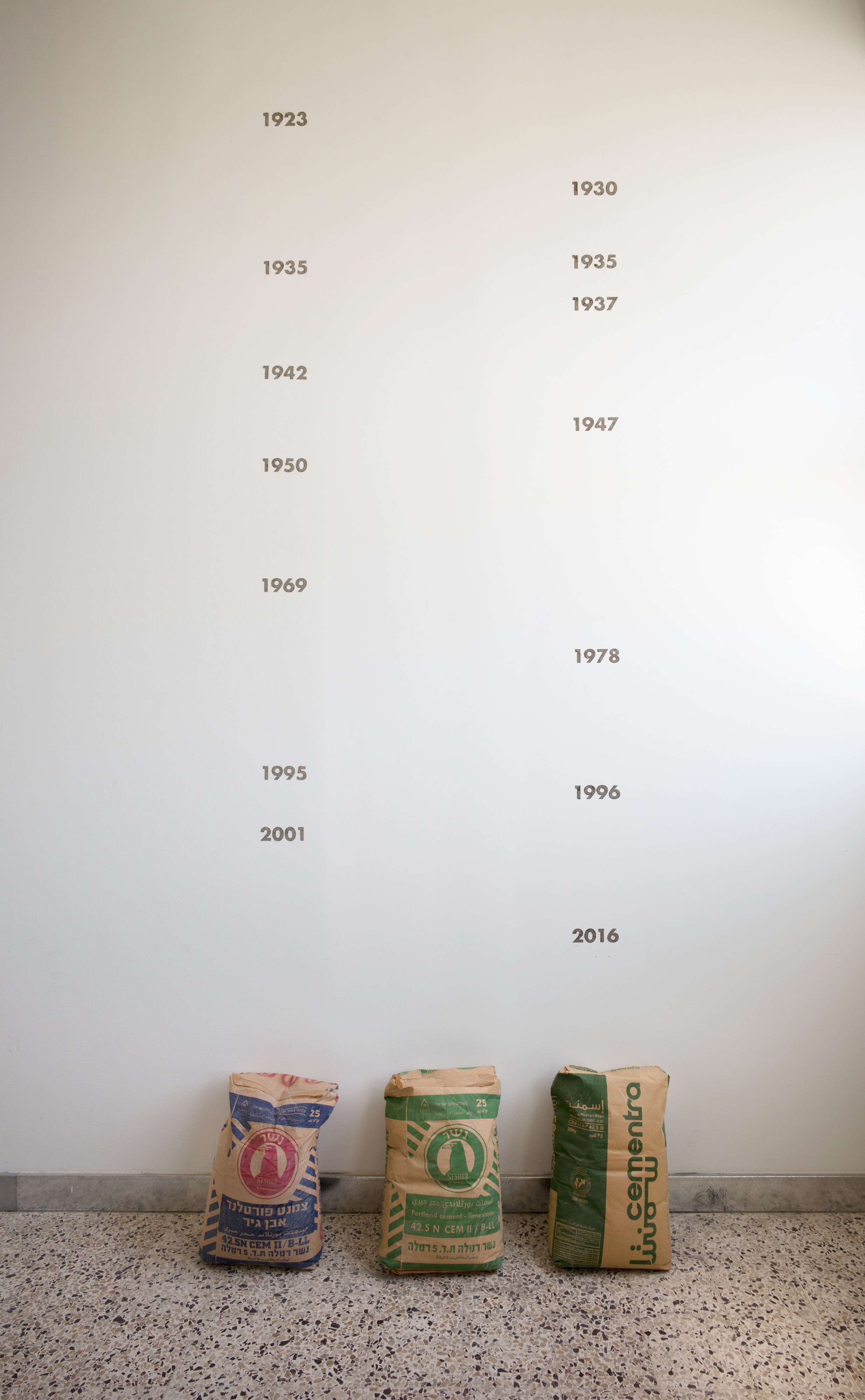 The Israeli Nesher Cement (left) and Jordanian Cementra Cement (right) are used to print significant year dates in the development of the cement industry in Israel/Palestine (details below). The dates on the left represent achievements of the Israeli cement company Nesher. Until 2021 there has been no Palestinian cement plant and the column on the right represents the failed attempts to establish one. The green bag in the middle is the same Israeli Cement as the one on the left, but bagged in Ramallah for sale in the West Bank.